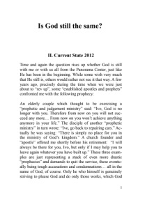 Is God still the same? II. Current State 2012 Time and again the question rises up whether God is still with me or with us all from the Panorama Center, just like He has been in the beginning. While some wish very much that He still is, others would rather not see it that way. A few years ago, precisely during the time when we were just about to “rev up”, some “established apostles and prophets” confronted me with the following prophecy: An elderly couple which thought to be exercising a “prophetic and judgement ministry” said: “Ivo, God is no longer with you. Therefore from now on you will not succeed any more… From now on you won’t achieve anything anymore in your life.” The disciple of another “prophetic ministry” in turn wrote: “Ivo, go back to repairing cars.” Actually he was saying: “There is simply no place for you in the ministry of God’s kingdom.” A church founder and “apostle” offered me shortly before his retirement: “I will always be there for you, Ivo, but only if I may help you to leave again whatever you have built up.” These three examples are just representing a stack of even more drastic “prophecies” and demands to quit the service, these eventually being tough accusations and condemnations… all in the name of God, of course. Only he who himself is genuinely striving to please God and do only those works, which God 1
